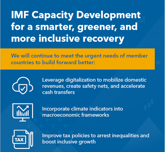 The IMF’s support aims to be flexible, innovative, and effective. The Initiative is agile and adapts to countries’ shifting priorities. This will also be an opportunity to continue to make positive changes for citizens through crosscutting reforms like tackling inequality, climate change, and the growing digital divide. Delivery draws on the IMF’s strengthened virtual delivery platforms, including an expanded online learning program.